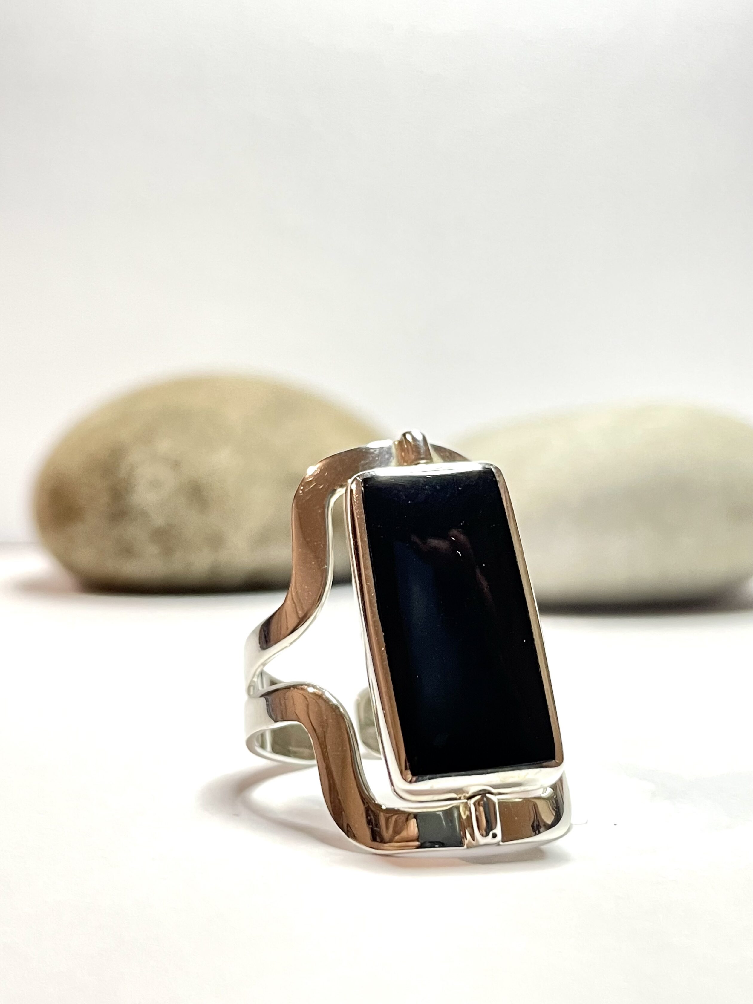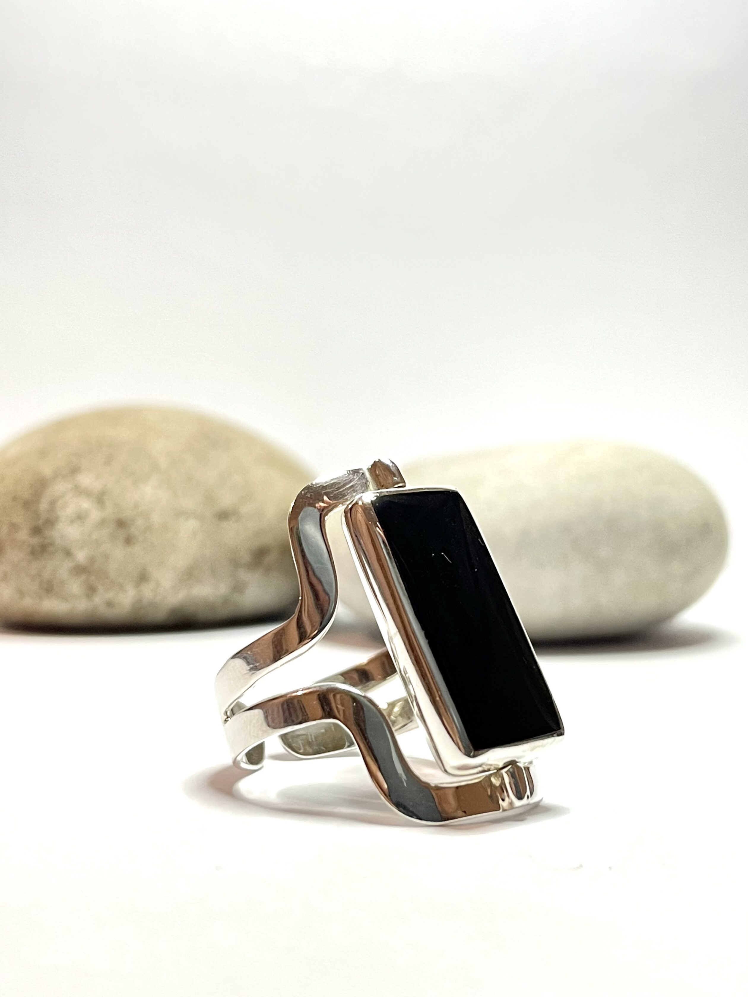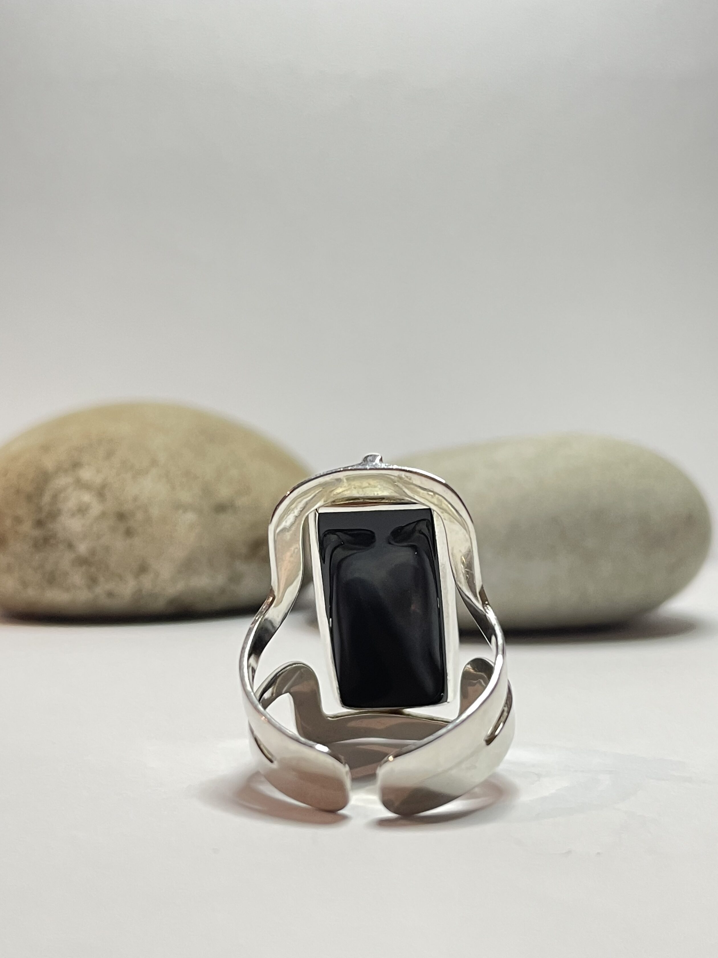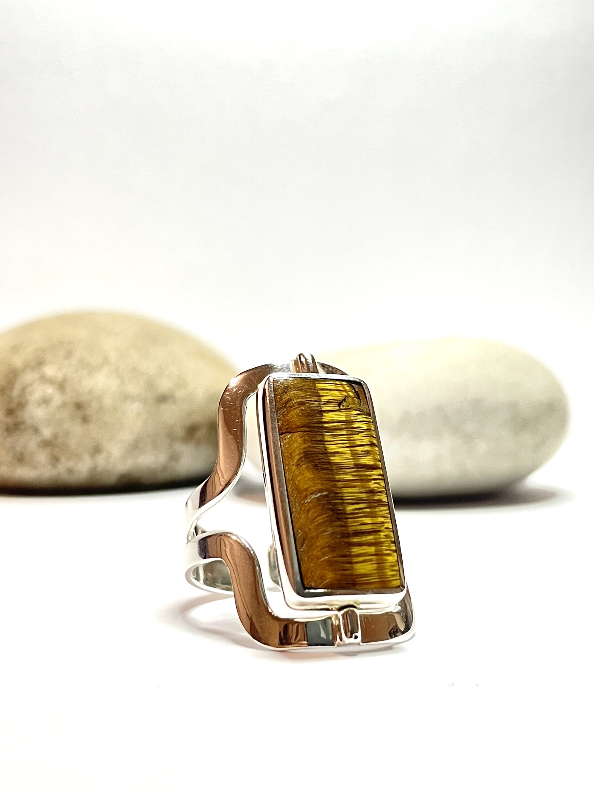 Sortija Duó Fortaleza, reversible con dos piedras naturales, Ojo de tigre y piedra Onix; graduables en Plata 950. Disponibles Talla 18