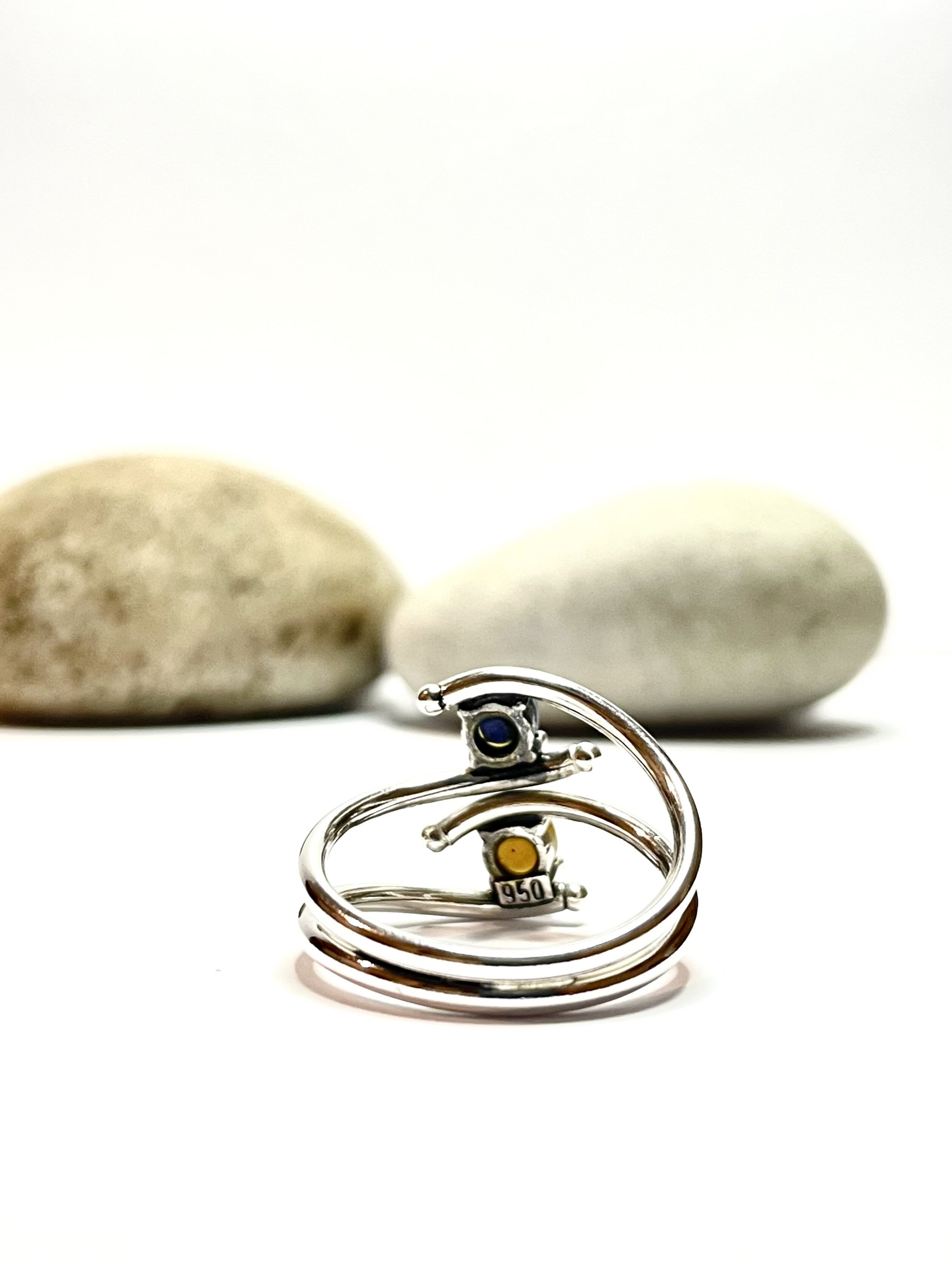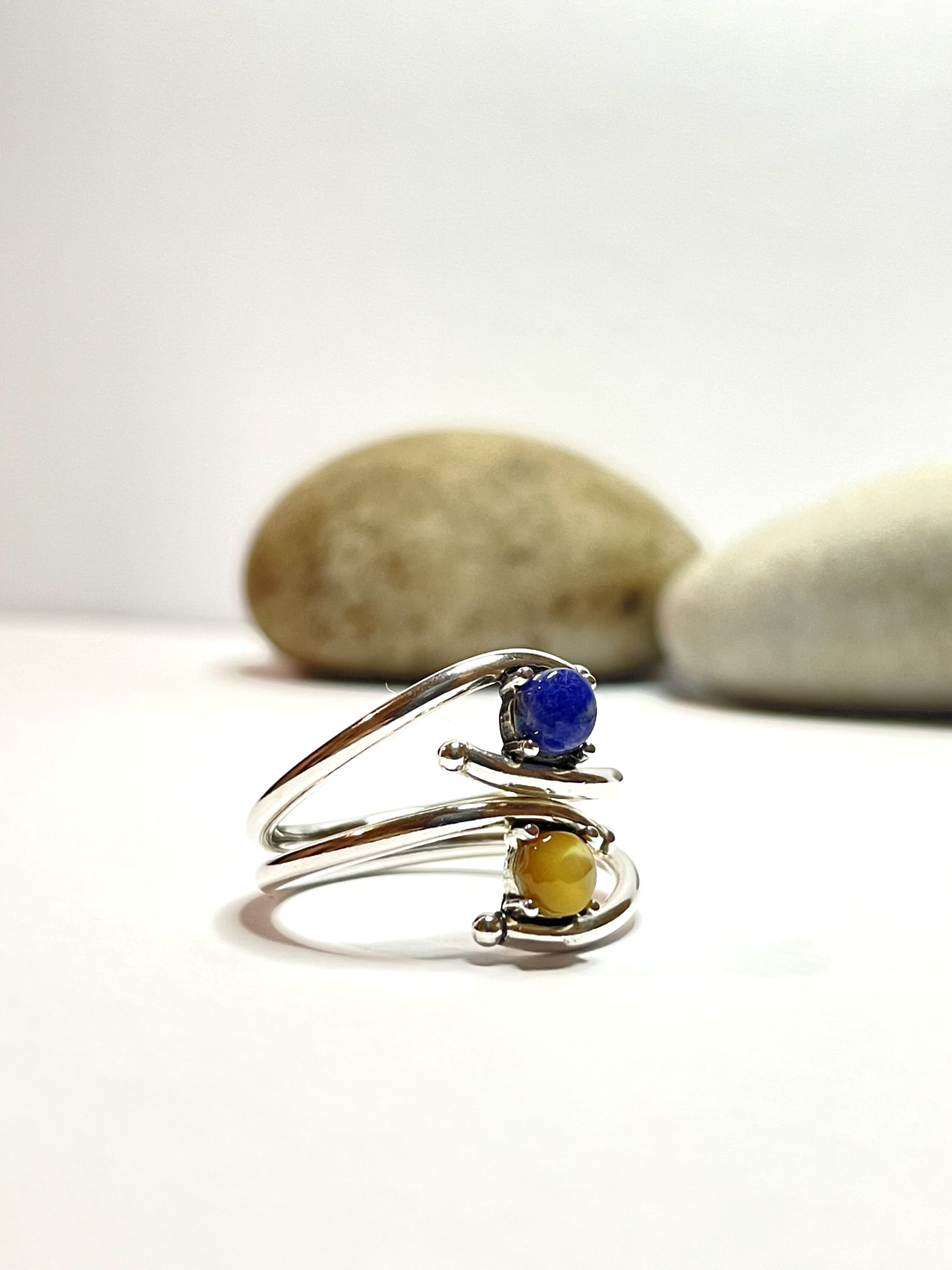 Sortija Dúo Verano-Invierno con piedras Lapizlázuli y Nacar Amarillo en plata 950. Disponible en Talla 16